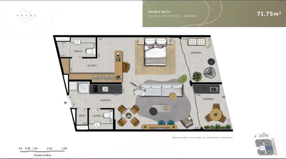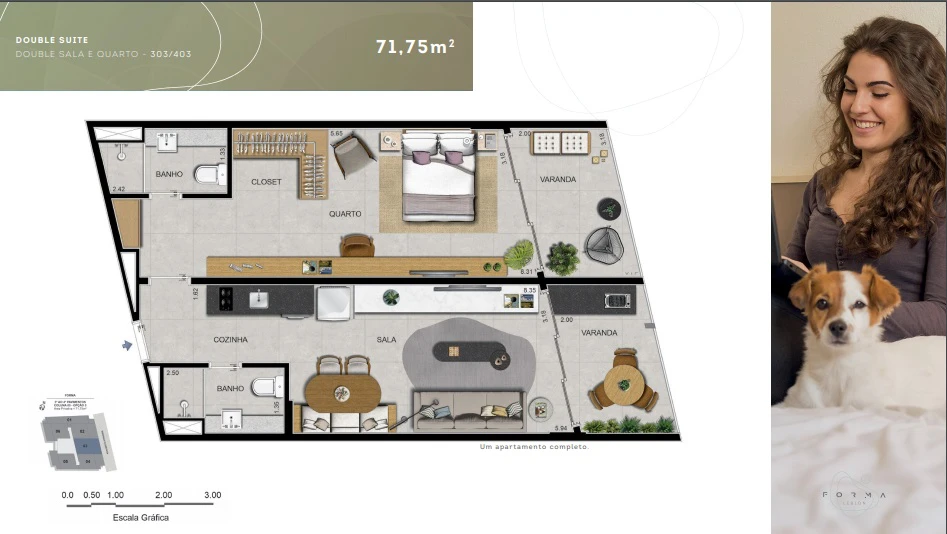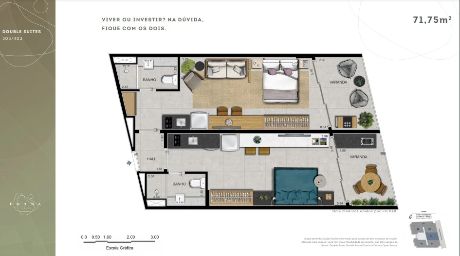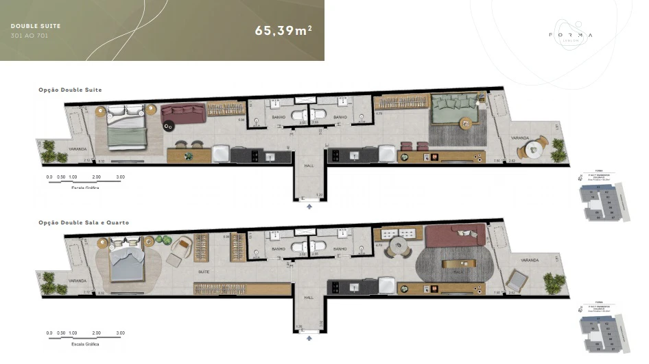 Apartamentos Double Suítes: de 65m² a 74m²