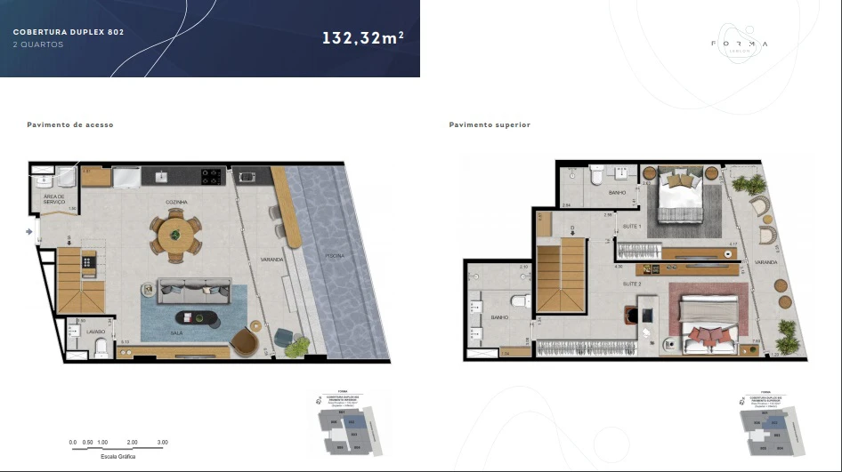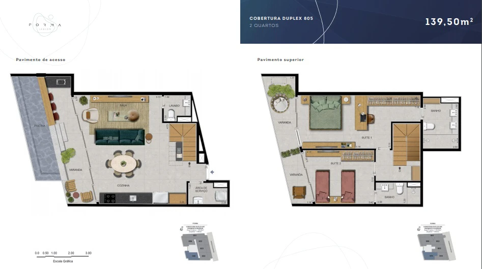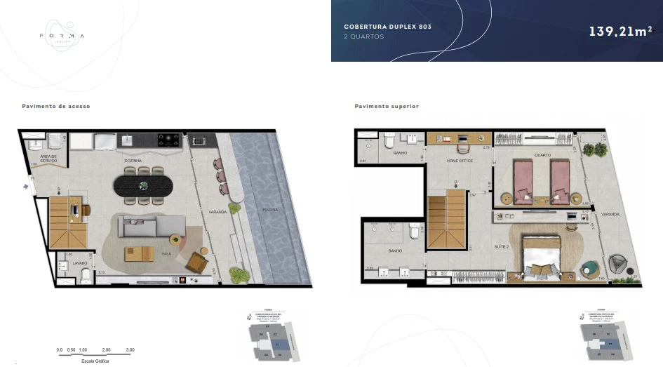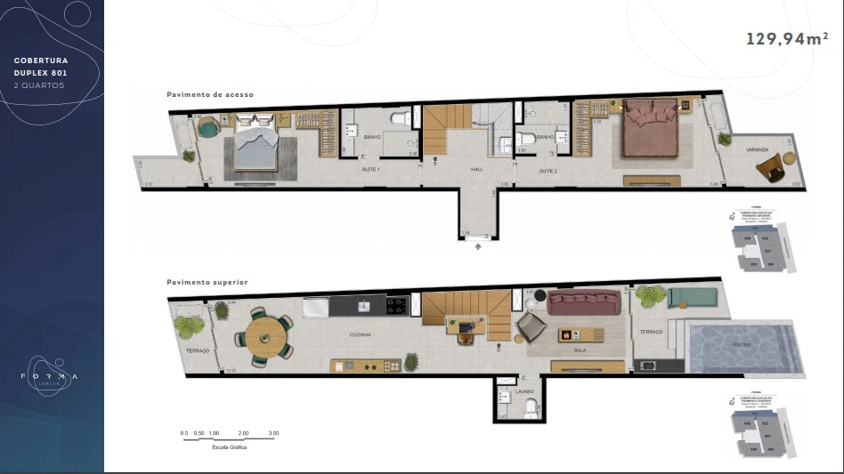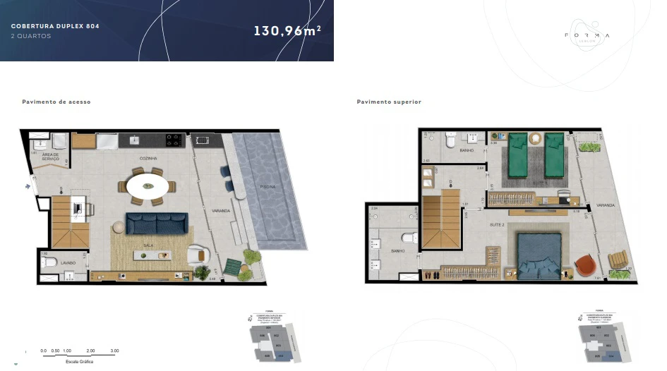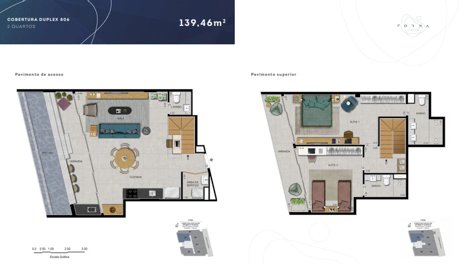 Coberturas Duplex de 2 quartos: de 129m² a 139m²,